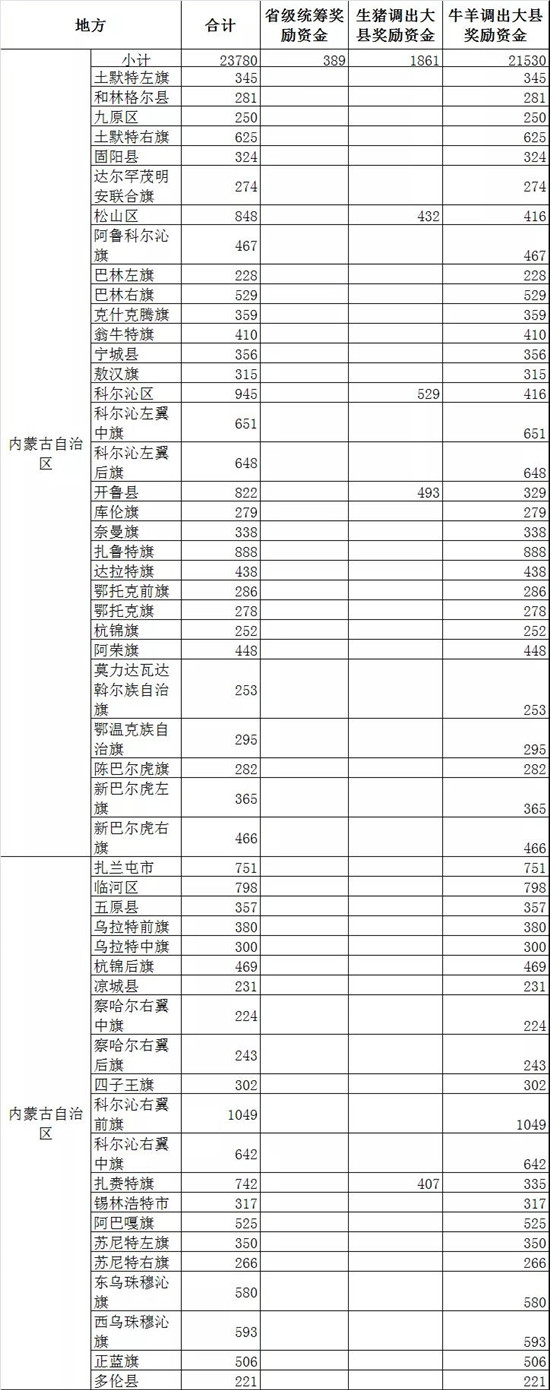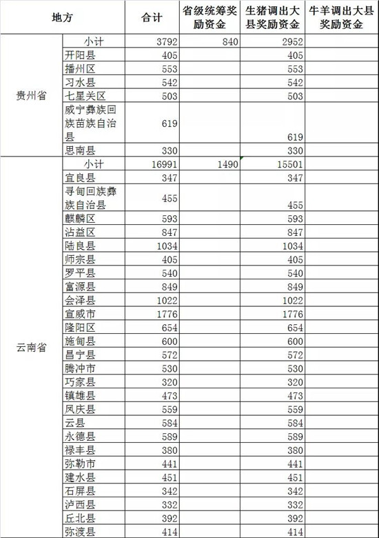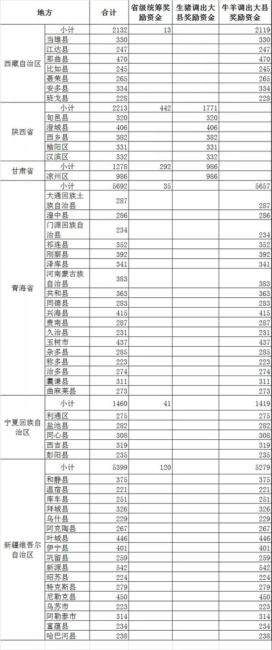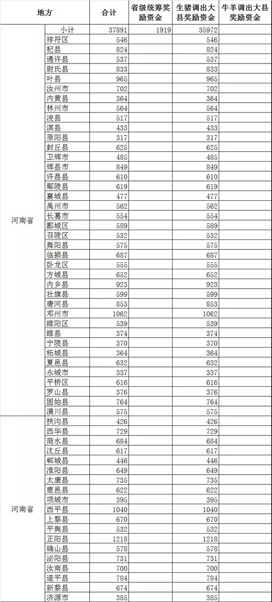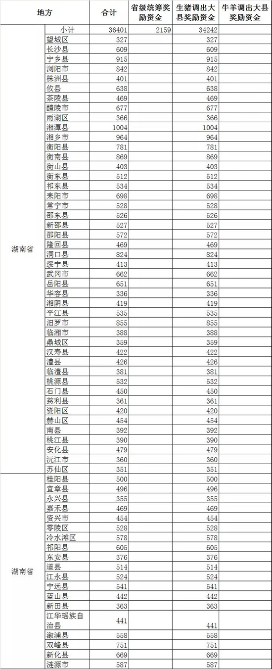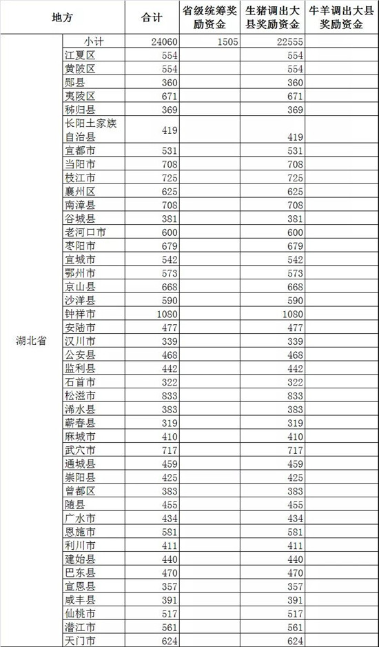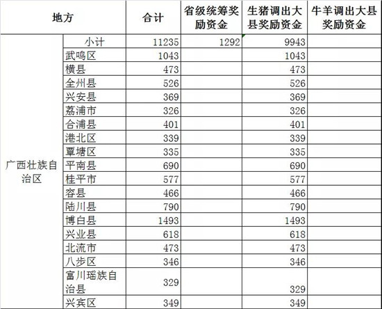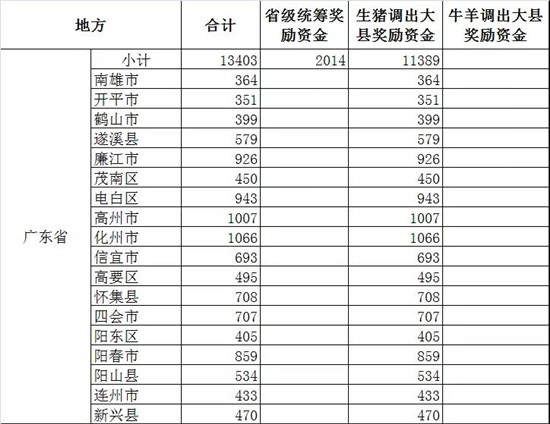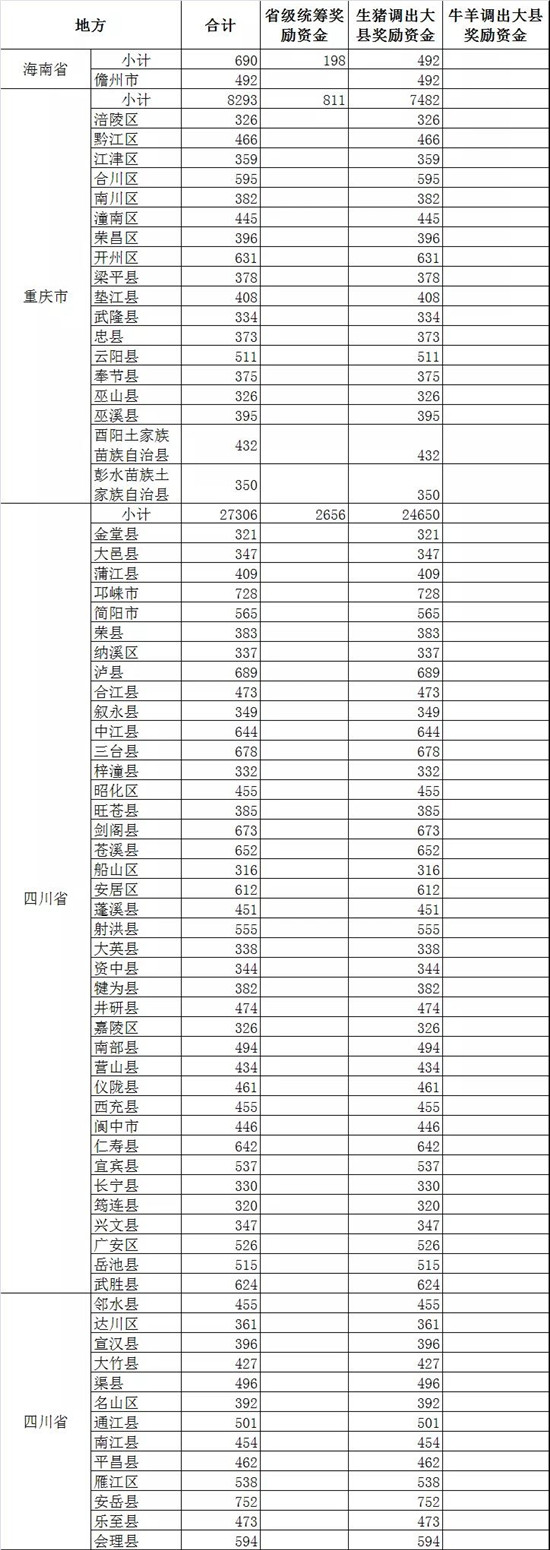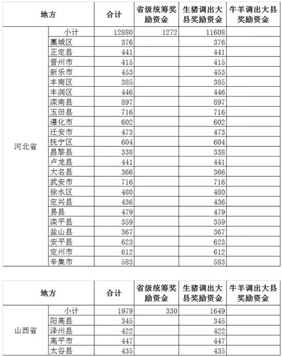 此外,四川52个生猪调出大县将获得2.47亿元资金奖励,湖北43个生猪调出大县将获得2.26亿元资金奖励,山东38个奖励2.04亿元,云南26个奖励1.55亿,广东18个奖励1.14亿元,广西18个奖励0.99亿元......(详情见附件)