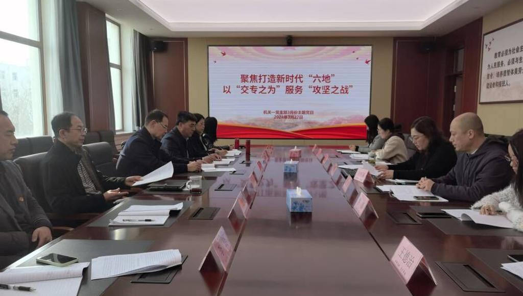2024年3月27日下午,机关一党支部在综合办公楼301会议室以“聚焦打造新时代‘六地’ 以‘交专之为’服务‘攻坚之战’”为题开展3月份主题党日活动。学校党委书记任冰参加主题党日活动。本次活动由机关一党支部书记周媛媛主持。 会上,与会同志认真学习了解了辽宁新时代“六地”的目标定位,深入学习了辽宁省委十三届六次全会精神和省委经济工作会议精神。会议强调,2024年,是辽宁全面振兴新突破行动的攻坚之年,也是实施学校“...