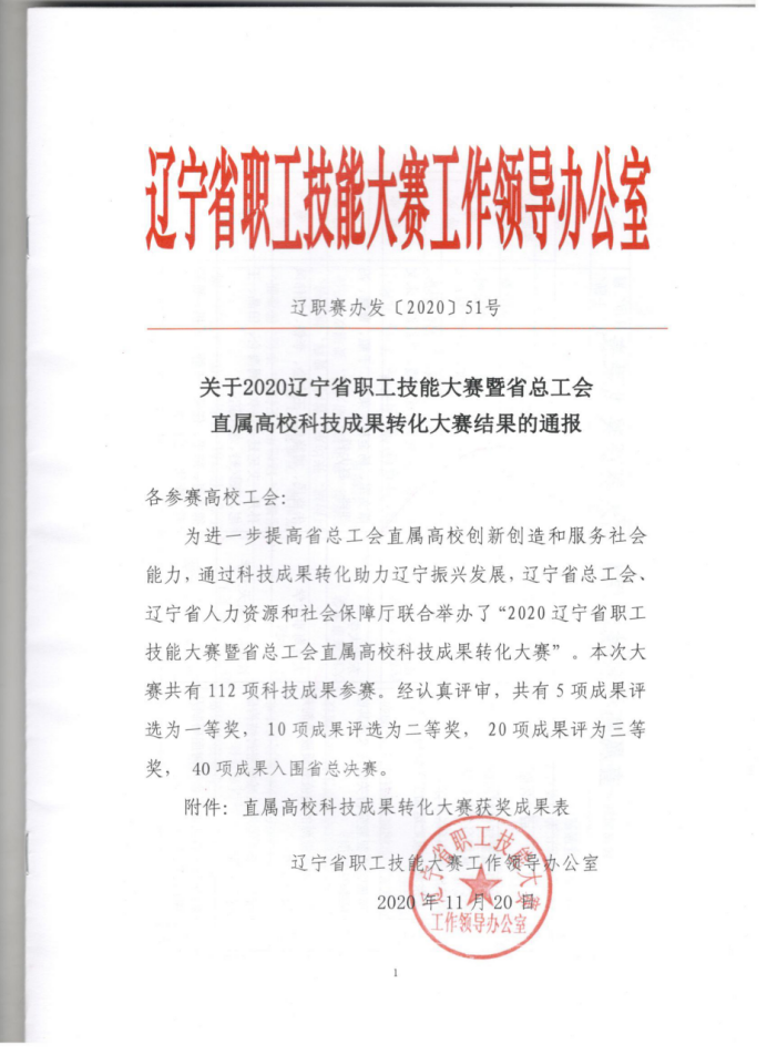 12月8日上午,2020年辽宁省职工技能大赛暨省总工会直属高校科技成果转化大赛颁奖典礼在沈阳航空航空大学举行。我校物流管理系谢元芒主持申报的“智能化出租汽车执法监督系统”项目荣获三等奖,信息工程系金雷老师主持申报的“新型压电式触觉传感器研究与应用”项目荣获入围决赛奖,我校荣获优秀组织奖。