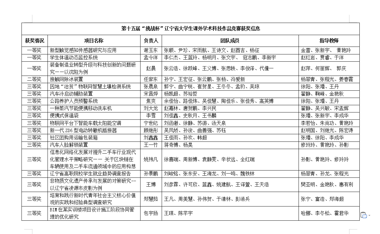其中,由金雷、张新宇、 黄艳玲老师指导的谢玉东、张顺、尹珍、宋雨航、王诗文、赵圆吉、杨征学生团队完成的《新型触觉感知传感器研究与应用》项目;赵红岩、贾睿、于洋老师指导的孟令洋、李仁杰、王蓝玲、杨明月、张文宇、 寇志鹏、李新宇学生团队完成的《学生体温动态监控系统》项目;赵萍、何丽辉、郭庆老师指导的赵晨、张云浩、徐跃峰、王义博、张思轶、李俊泽、代僮一学生团队完成的《装备制造业转型升级与科技创新的问题研究——以沈阳为例》项目进入省级决赛,并获得第十五届“挑战杯”辽宁省大学生课外学术科技作品竞赛一等奖的好成绩。