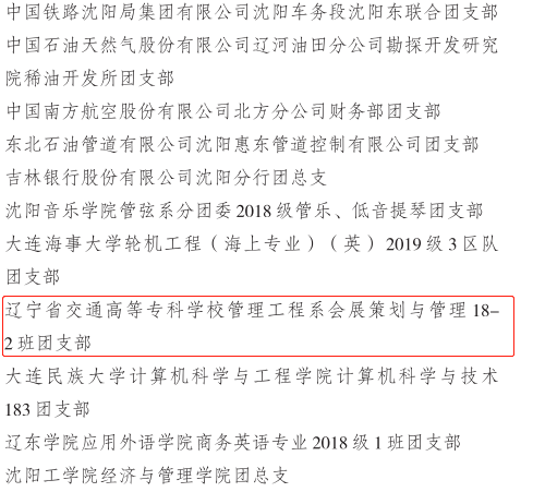 近日,共青团辽宁省委员会公布《关于表彰2020年度“辽宁省五四红旗团委”“辽宁省先进团委”“辽宁省五四红旗团支部”“辽宁省优秀共青团干部”“辽宁省优秀共青团员”的决定》(辽团发【2021】7号),表彰2020年度表现突出的团组织、团干部和广大团员。全省共有14所本、专科高校团委、8所高校基层团支部位列其中。我校团委荣获“辽宁省先进团委”荣誉称号,管理工程系会展策划与管理专业18-2团支部荣获“辽宁省五四红旗团支部”荣誉称号,道路与桥梁工程系赵泽政荣获“辽宁省优秀共青团员”荣誉称号。