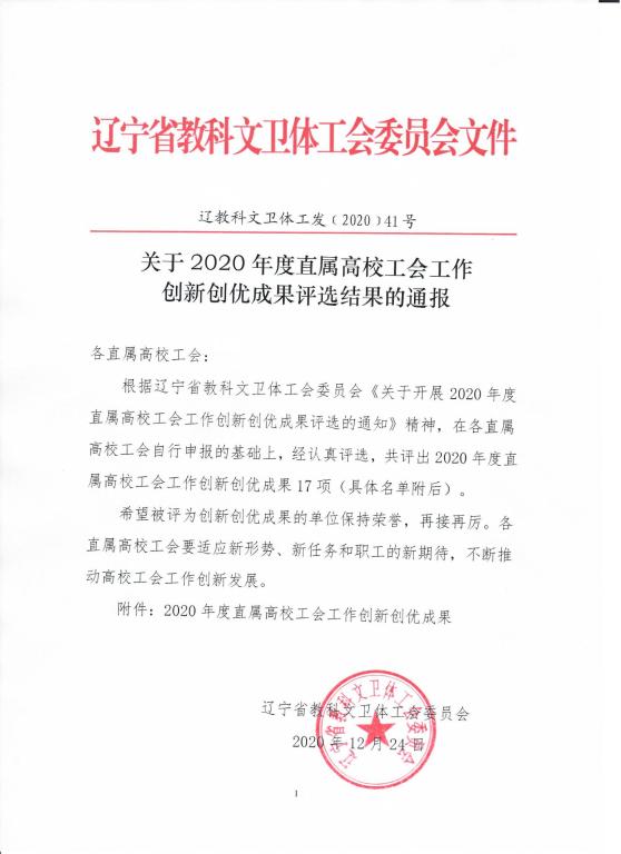 为进一步增强高校工会干部的创新创优意识,推动高校工会工作体制机制、理论实践、方式方法的创新,促使高校工会工作出亮点、创品牌,进一步增强高校工会组织的吸引力、凝聚力和创造力。省教科文卫体工会组织开展了2020年度直属高校工会工作创新创优成果评选活动,各高校积极参与报名,经专家认真评选,由我校工会申报的“开展教职工心理关爱项目”荣获2020年度省属高校工会工作创新创优成果奖。
