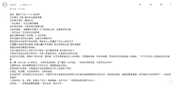本次思政大课以沈阳“九·一八”历史博物馆中有代表性的展品、文物为载体,带领学生重温了那段东北人民浴血抗日的不屈岁月。课程的学习在师生中引起强烈反响和热议,思政部教师在课程结束后依托学习通平台设置了“勿忘‘九一八’”的相关讨论话题,各年级学生积极参与回帖,倾诉学习感受。学生们为中国人民,尤其是东北抗日联军在长达十四年的时间里于白山黑水间顽强抵抗日寇残暴侵略的精神所感动,大家纷纷留言表示要铭记历史,珍惜和平,在新时代继续传承弘扬伟大的抗战精神,坚定不移跟党走,在民族复兴的道路上奋勇前进。
