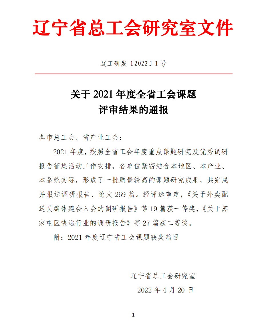 据悉,2021年度省总工会组织开展重点课题及优秀调研报告征集活动,各申报单位紧密结合本地区、本产业、本系统实际,形成了一批质量较高的课题研究成果,共完成调研报告、论文269篇,经评选审定,最终评选出46篇获奖成果,其中19篇荣获一等奖。