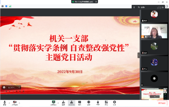 为了进一步锤炼全体党员的政治品质,筑牢信仰之基,加强对中国共产党党徽党旗内涵的理解,维护党徽党旗的尊严,切实发挥党徽党旗的政治功能,9月30日上午,机关一支部组织全体党员开展了“贯彻落实学条例 自查整改强党性”主题党日活动。活动在校内综合办公楼301会议室设立了分会场,其余党员通过腾讯会议参加。
