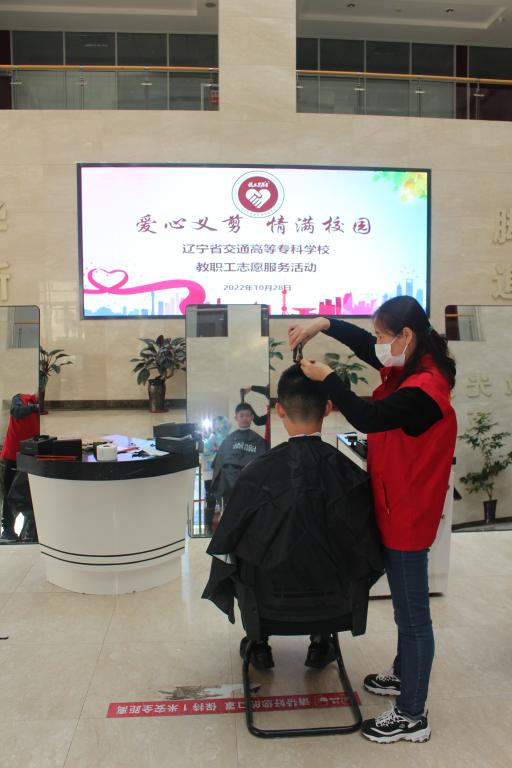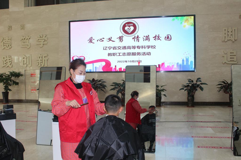 2022年10月28日下午,我校工会在学生素质教育中心一楼大厅组织开展了“爱心义剪 情满校园”教职工义务理发志愿服务活动,为士官班的同学们义务理发。