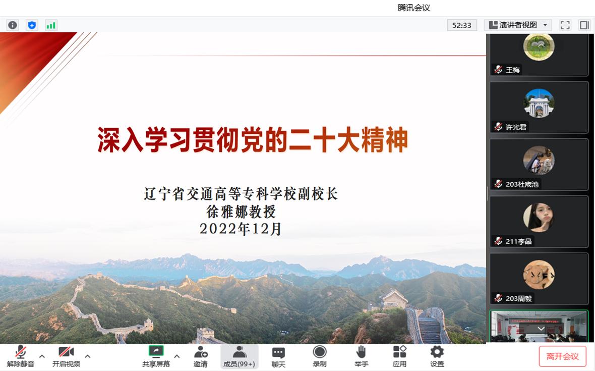 为深入学习贯彻党的二十大精神,切实将党的二十大精神学深悟透,根据学校《学习贯彻党的二十大精神宣讲工作方案》,12月2日,徐雅娜副校长在机电楼406会议室以《深入学习贯彻党的二十大精神》为题进行了宣讲,本次会议通过线上线下相结合的方式进行,全系教师和学生代表参会。