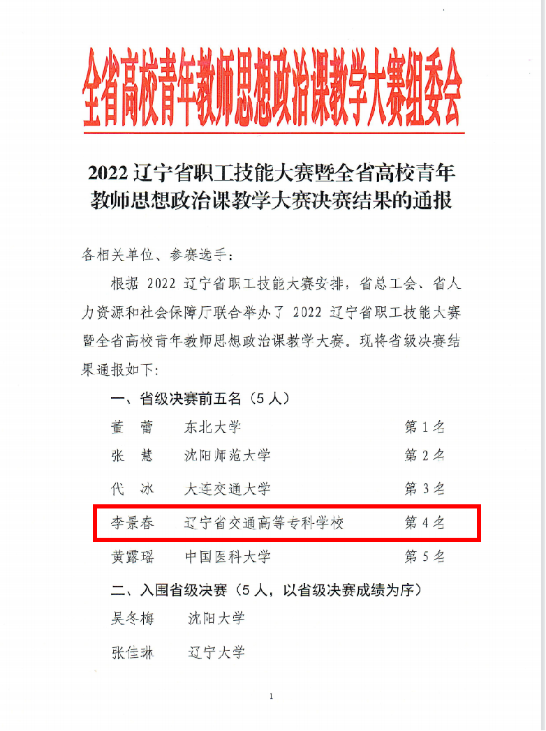 近日,由辽宁省总工会、辽宁省人力资源和社会保障厅联合举办的2022年辽宁省职工技能大赛落下帷幕。本届比赛由省总工会直属高校、各市属高校代表共同参加。比赛按照项目共分为全省高校青年教师教学竞赛和全省高校青年教师思想政治课教学大赛两个并列赛事。其中全省高校青年教师教学竞赛又分为文科组、理科组、工科组、医学组四个组别。比赛由全省40岁以下的数名青年教师报名参与,经预赛、省级初赛直至省级决赛。经过激烈的角逐,我校马克思主义学院教师李景春以全省高校青年教师思想政治课教学大赛全省第四名,管理工程系教师王婉姝以文科组全省第四名的好成绩完成了本次全省青年教学竞赛。我校工会在组织参与比赛过程中动员积极有力、部署及时高效、比赛成绩优异,荣获全省高校青年教师思想政治课教学大赛“优秀组织奖”和全省高校青年教师教学竞赛“优秀组织奖”。