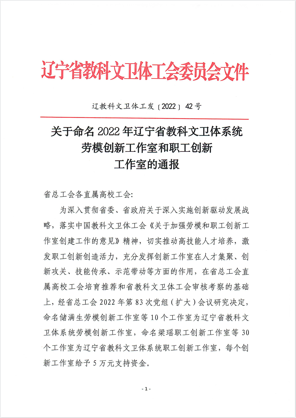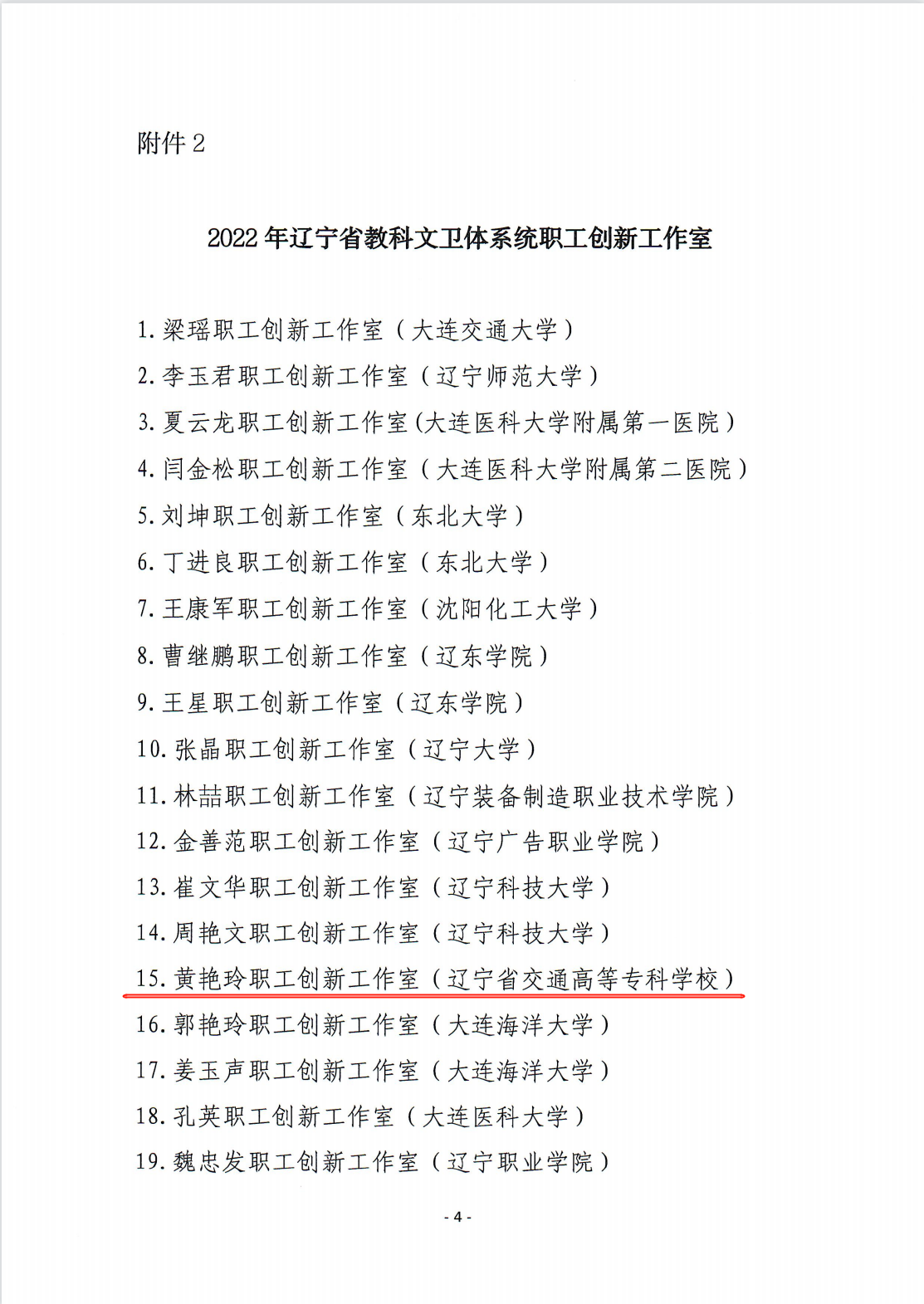 近日,辽宁省总工会公布了《关于命名2022年度辽宁省教科文卫体系统劳模创新工作室和职工创新工作室的通报》,我校黄艳玲职工创新工作室被授予为“辽宁省教科文卫体系统职工创新工作室”。