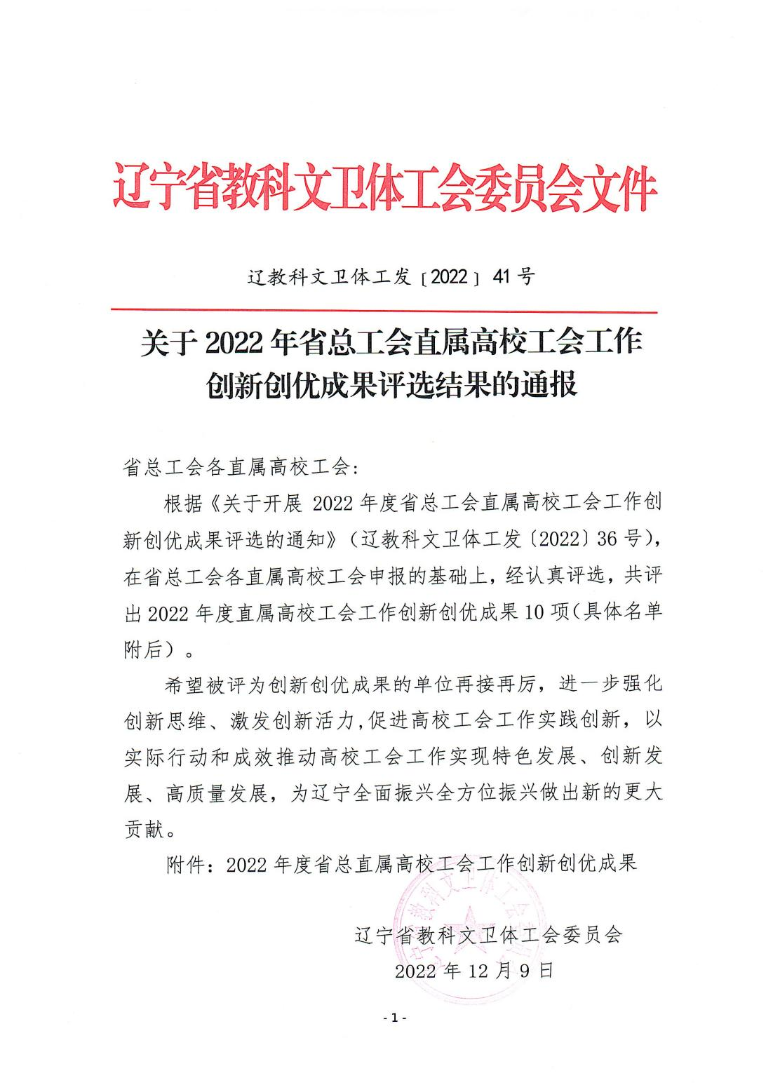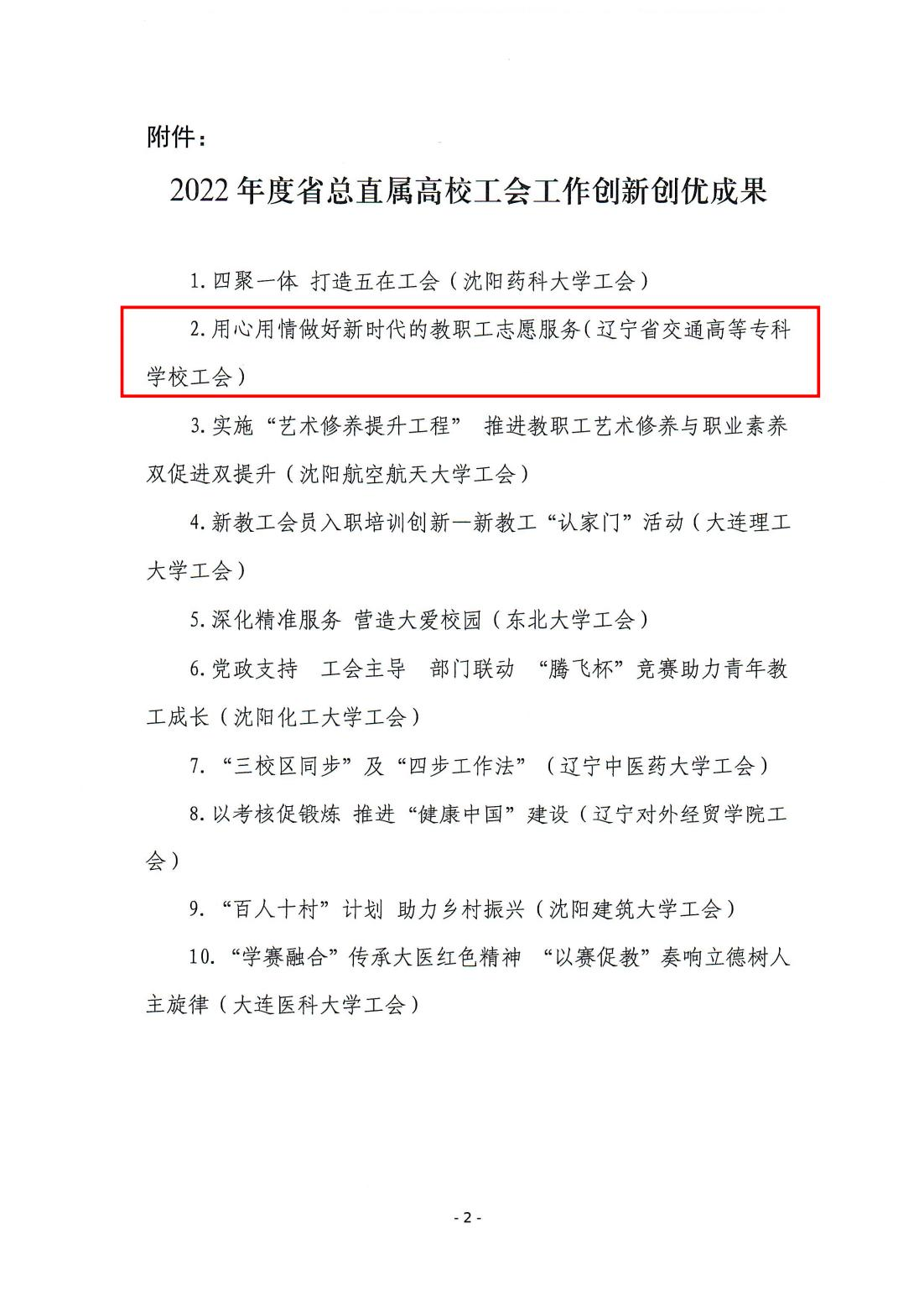 近日,在2022年省总工会直属高校工会工作创新创优成果评选中,我校工会的《用心用情做好新时代的教职工志愿服务》工作项目获批“2022年度省总直属高校工会工作创新创优成果”,全省仅有10所高校获此殊荣。
