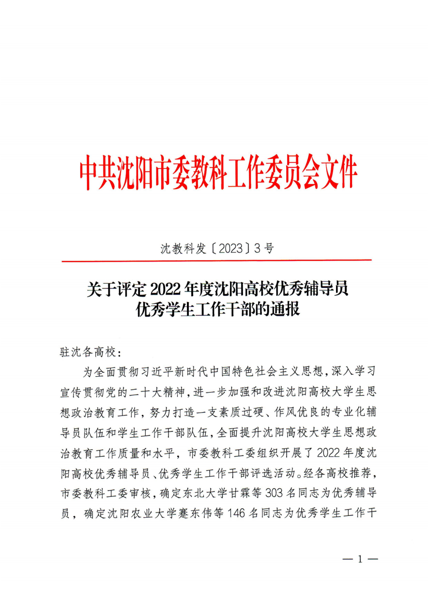 近日,由中共沈阳市委教科工作委员会组织开展的2022年度沈阳高校优秀辅导员和优秀学生工作干部评选活动结果揭晓,我校汽车工程系崔波同志、物流管理系李迪同志、信息工程系刘新同志、机械电子工程系栾福鑫同志、建筑工程系曲迪同志、管理工程系许晨曦同志、轨道交通工程系杨丽同志荣获“2022年度沈阳高校优秀辅导员”称号,学生工作处副处长李闯同志、机械电子工程系党总支副书记吴哲同志、建筑工程系党总支副书记樊义麟同志荣获“2022年度沈阳高校优秀学生工作干部”称号。