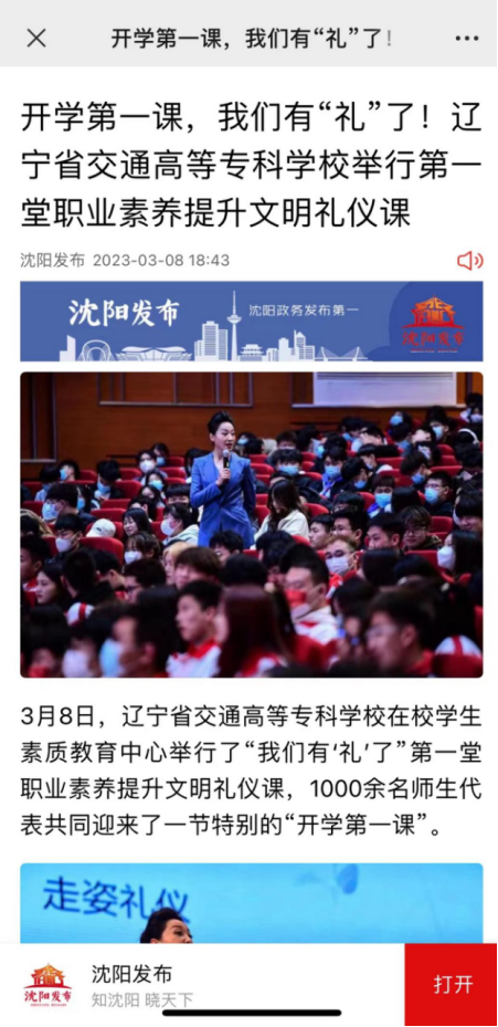按照中共辽宁省委教育工委、辽宁省教育厅关于组织全省高校上好2023年春季学期“开学第一课”的文件要求,3月8日14:00时,校团委在学生素质教育中心礼堂举行我们有“礼”了——第一堂职业素养提升文明礼仪课。沈阳广播电视台首席主持人、沈阳市文史研究馆研究员、全国三八红旗手、2021中国好人宫正进行现场授课。校团委全体人员、各系团总支书记、各系教师代表及各系学生代表共计一千余名师生出席活动。仪式由校团委干事贾晨阳主持。