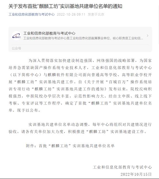 我校是全国首批共18家“麒麟工坊”实训基地共建单位之一,将在信息工程系计算机基础教室在国产操作系统教学、培训、论证等方面开展共建。“麒麟工坊”是集人才培养、认证培训、技术创新等功能于一体、具有信创产业特色的实训基地。此次“麒麟工坊”挂牌成立是我校服务国家产教融合重大战略需求、引产入校、深入开展产教融合协同育人的重大改革实践。