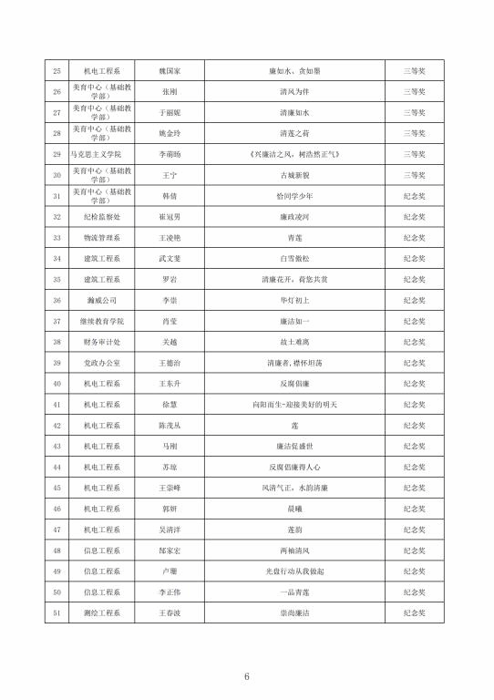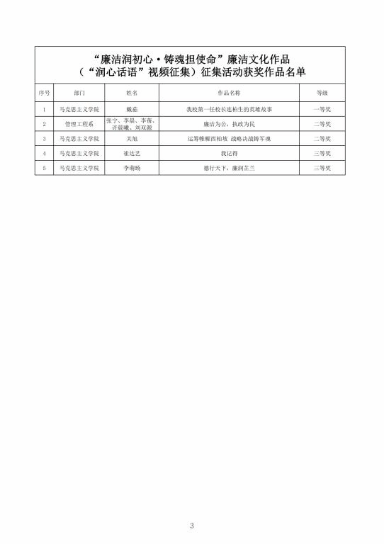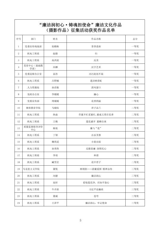 征集廉洁文化作品,加强清廉校园建设。面向全校师生开展了“廉心文语”校园征文、“润心话语”视频征集、“清心妙语”创意征集、廉政教育书法、绘画、摄影作品征集活动。活动共征集到作品二百余项。学校纪委组织专家对征集作品进行评比,最终评选出一、二、三等奖作品若干(获奖名单见附件),充分调动了教职工参与廉洁文化建设的主动性、积极性和创造性,在师生中营造浓厚廉洁文化氛围。