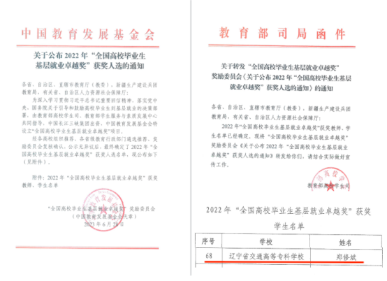 近日,教育部高校学生司公布2022年“全国高校毕业生基层就业卓越奖”获奖人选,在此次评选中,我校2017届机电工程系应用电子技术专业毕业生郑修斌荣获“全国高校毕业生基层就业卓越奖”。