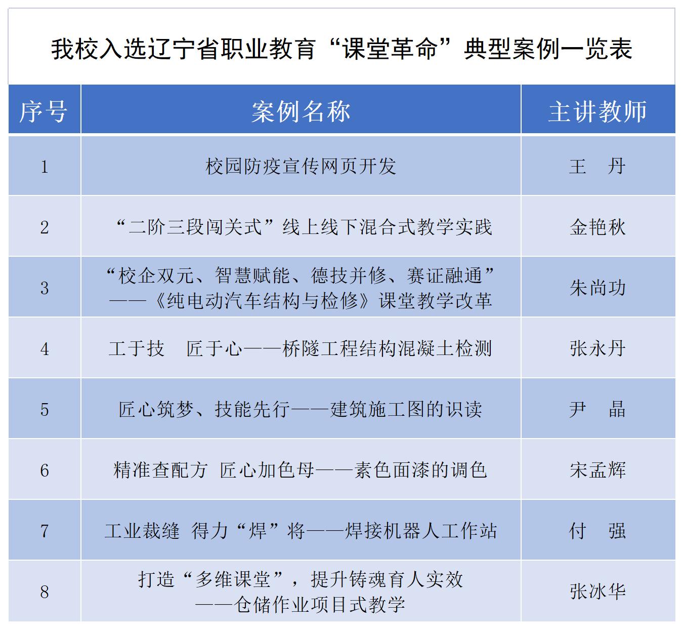 近日,辽宁省教育厅发布了《关于公布2022年辽宁省职业教育“课堂革命”典型案例的通知》(辽教通〔2023〕206 号),我校8个案例入选2022年辽宁省职业教育“课堂革命”典型案例。