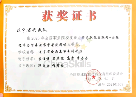 7月24日至26日,2023年全国职业院校技能大赛(高职组)“互联网+国际经济与贸易”赛项在贵州交通职业技术学院举行,来自全国职业院校的65支代表队同台竞技。经过激烈角逐,我校物流管理系郭贞贞、程震舟两位教师指导的由李佳健、吴英俊、高鑫和李丹丹四名学生组成的参赛队荣获团体三等奖,实现了在该赛项国赛获奖的历史性突破。