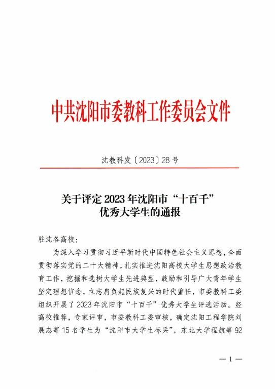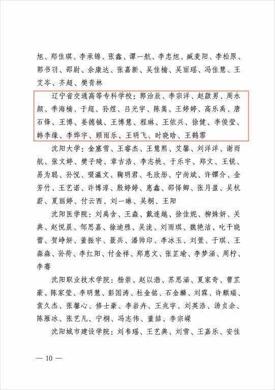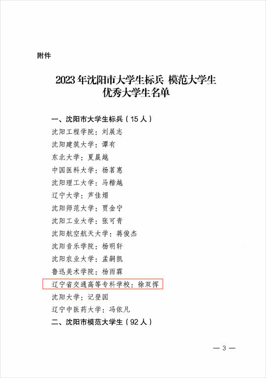 近日,由中共沈阳市委教科工作委员会组织开展的2023年度沈阳市“十百千”优秀大学生评选活动结果揭晓,我校管理工程系2021级会展策划与管理专业徐双挥同学荣获“2023年度沈阳市大学生标兵”、道路与桥梁工程系2021级道路与桥梁工程技术专业吴泽湖同学荣获“2023年度沈阳市模范大学生”称号,郭治辰等25名同学荣获“2023年度沈阳市优秀大学生”称号。