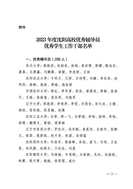 近日,由中共沈阳市委教科工作委员会组织开展的2023年度沈阳高校优秀辅导员和优秀学生工作干部评选活动结果揭晓,我校汽车工程系樊亚明同志、建筑工程系揭丹同志、信息工程系李正伟同志、物流工程系王庆伟同志、测绘工程系王伟冬同志、机电工程系张晓婷同志荣获“2023年度沈阳高校优秀辅导员”称号,学生工作处处长王楠同志、汽车工程系党总支副书记孙影同志、心理健康教研室主任李良敏同志荣获“2023年度沈阳高校优秀学生工作干部”称号。