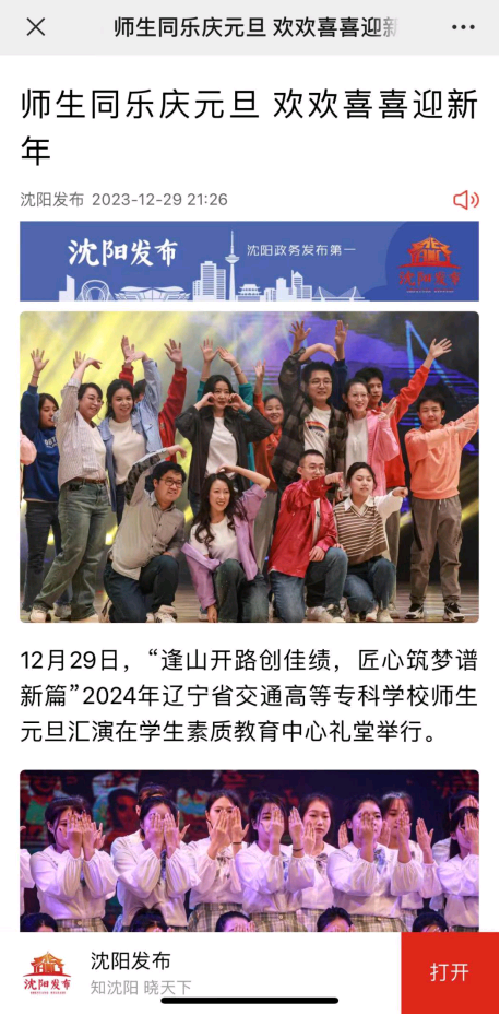 2023年12月29日13:30“逢山开路创佳绩 匠心筑梦谱新篇”2024年辽宁交专师生元旦文艺汇演华丽上演。省社科联党组书记、主席石坚以及学校领导班子成员、中层干部和师生代表近1000人共同欣赏了精彩的文艺演出。