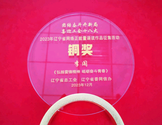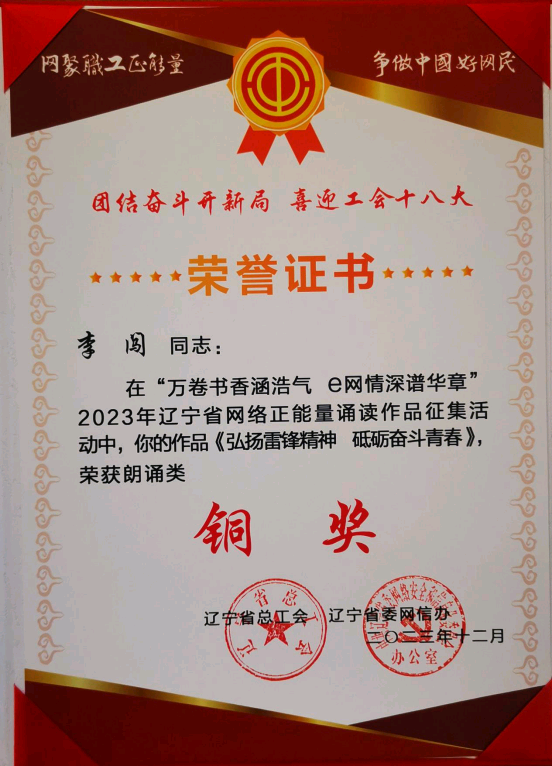 近日,辽宁省总工会与省委网信办共同举办的“网聚职工正能量 争做中国好网民”主题活动圆满结束。我校学生工作处李闯老师在子活动网络正能量诵读作品征集活动中荣获朗诵类铜奖。