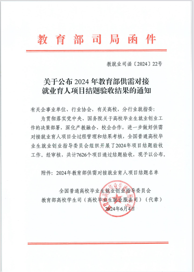 近日,教育部发布《关于公布2024年教育部供需对接就业育人项目结题验收结果的通知》(教就业司函〔2024〕22号)文件,全国高校7626个项目通过结题验收,我校8个项目顺利结项。