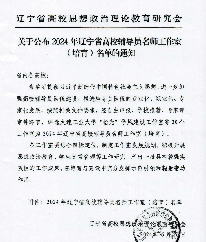近日,辽宁省高校思想政治理论教育研究会公布了2024年辽宁省高校辅导员名师工作室(培育)名单,全省共20个工作室入选。我校学生工作处处长王楠老师辅导员团建办公室成功入选2024年辽宁省高校辅导员名师工作室(培育)名单。