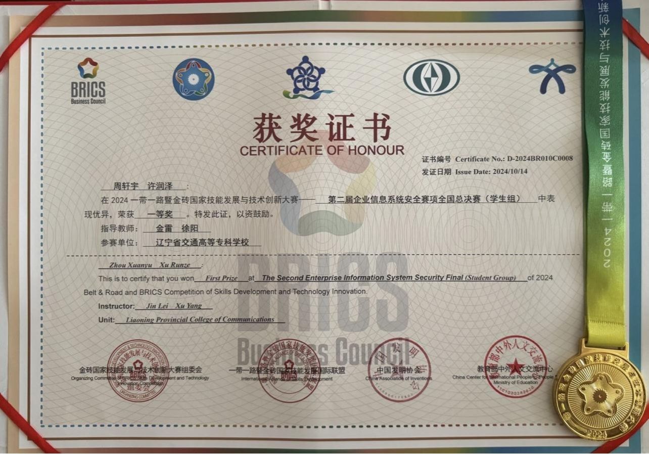 2024年10月11日至14日,备受瞩目的一带一路暨金砖国家技能发展与技术创新大赛“企业信息系统安全”赛项全国总决赛在湖南省娄底市隆重举行。此次大赛吸引了来自全国各地的百余支顶尖参赛队伍,数百名学子在此展开了激烈的技术比拼与智慧交锋。值得一提的是,我校信息工程系的两名杰出学生—许润泽和周轩宇,在金雷和徐阳两位老师的悉心指导下,凭借卓越的技术水平和出色的团队合作精神,在激烈的竞争中脱颖而出,荣获了本次大赛的国赛一等奖。这一殊荣不仅是对他们个人努力和才华的肯定,也是对我校信息工程系教学水平和科研实力的有力证明。