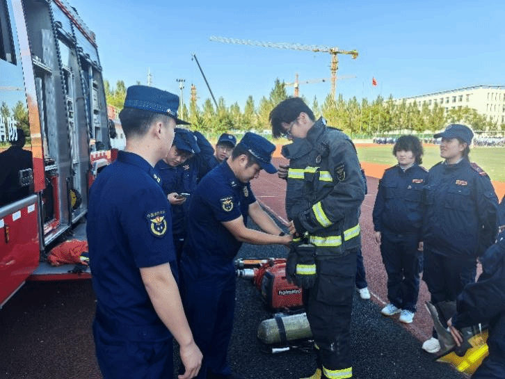 首先是消防知识培训。由沈阳市消防支队虎石台南大街消防站站长助理孙博警官为全体新生作消防安全培训。孙博向同学们详细介绍了灭火器的使用步骤、消防水带的连接方法以及防毒面具的正确佩戴方式。又通过校园火灾典型案例分析,强调了初期火灾处置的重要性和常见误区,传授了低姿前行、湿毛巾捂口鼻等火场逃生技巧。
