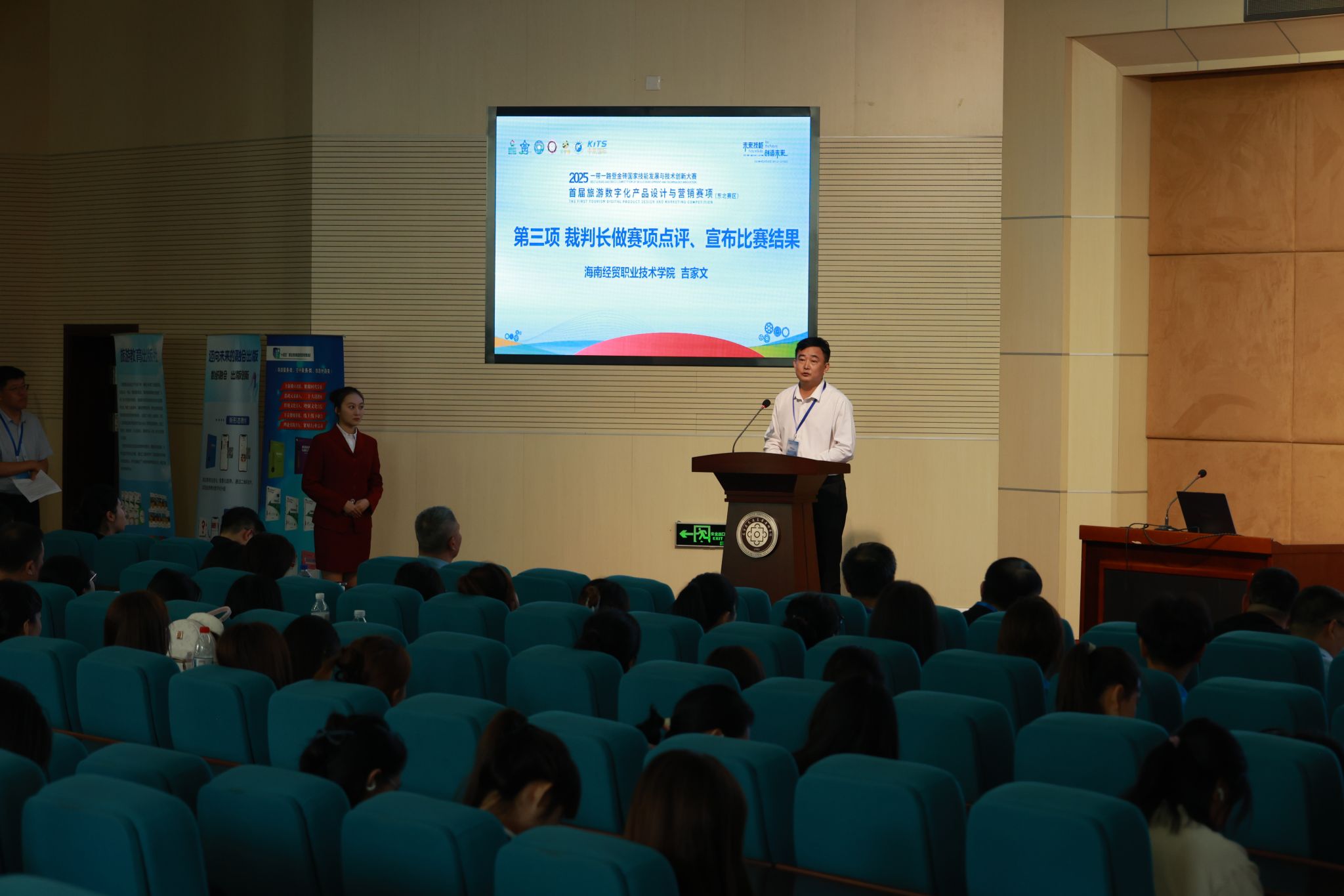 9月21日,闭幕式举行,副校长张洪革到会致辞。他向获奖选手表示祝贺,向裁判员、工作人员及社会各界致谢,指出,赛事洋溢着拼搏热情,选手作品融合东北文旅特色与数字活力,生动诠释“技能立身、创新为魂”,彰显区域文旅数字化转型的希望。他为裁判员颁发证书,感谢他们维护赛事公正。并寄语选手深耕数字文旅领域,期待院校与业界深化合作,为东北振兴与“一带一路”人文交流注入数字动能。