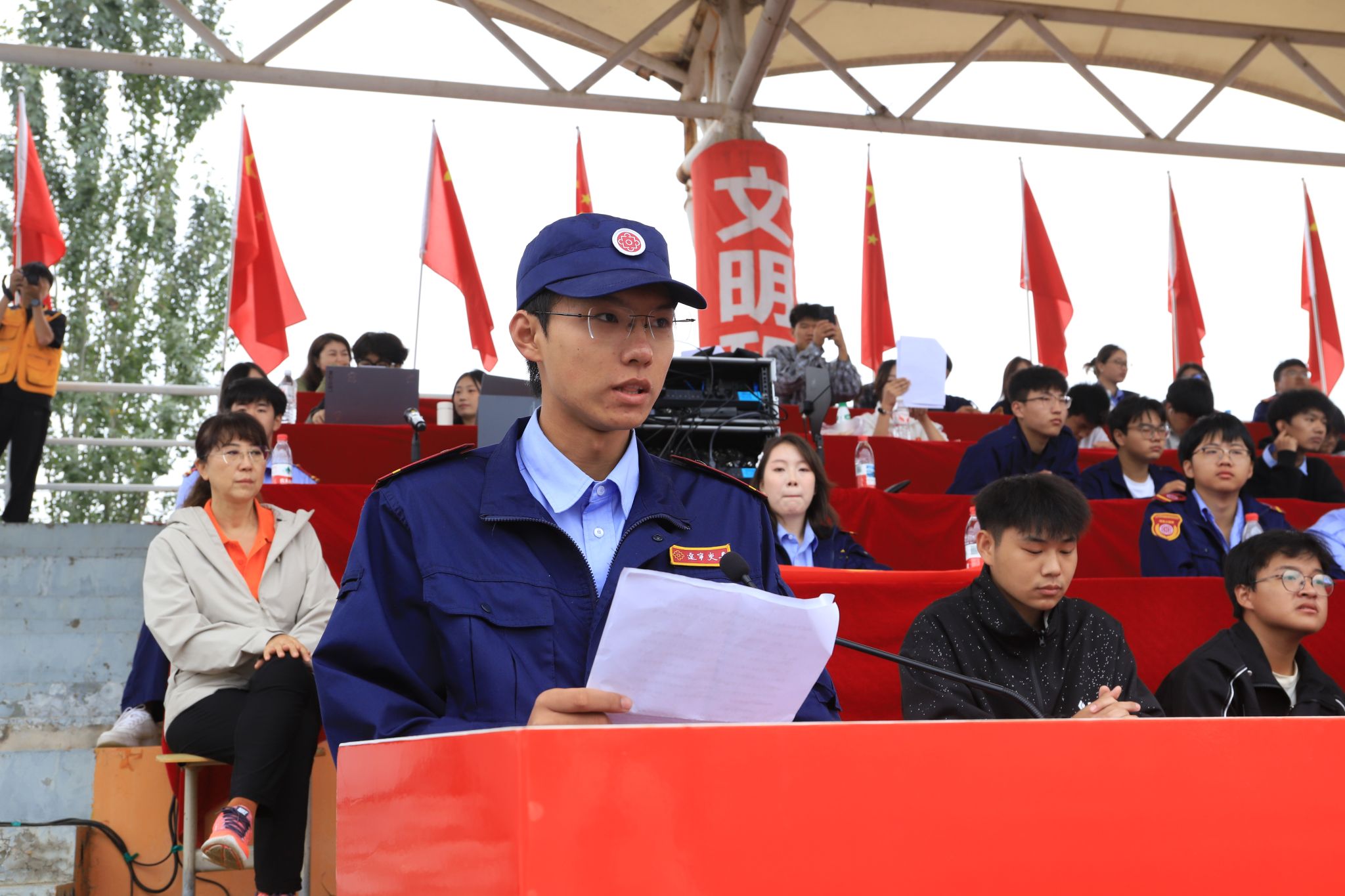 国旗护卫队英姿飒爽、步履铿锵,护送中华人民共和国国旗入场。鲜艳的五星红旗冉冉升起,全场奏唱国歌,大会正式开始。首先进行新生军训汇报表演。受阅队伍由各教学系和警士管理学院推选出的10支优秀专业方队及1支女子方队组成。同学们以洪亮的口号与军姿作礼,精神抖擞、步伐整齐,依次走过主席台接受检阅,那一阵齐过一阵的踏步声,熔铸成青春最完美的交响。由女学员表演的女子匕首操表演,动作整齐、步调一致、精神焕发、意志昂扬,宛如坚不可摧的钢铁长城。由男学员表演的男子刺杀操,以刚劲的姿态、铿锵的动作,把青春的热血与阳刚展现得淋漓尽致。由警士生完成擒敌震脚功擒敌动作表演,如猛虎蓄势、锐气逼人,震脚铿锵稳底盘似惊雷撼地,擒敌干脆显硬功如利刃出鞘。