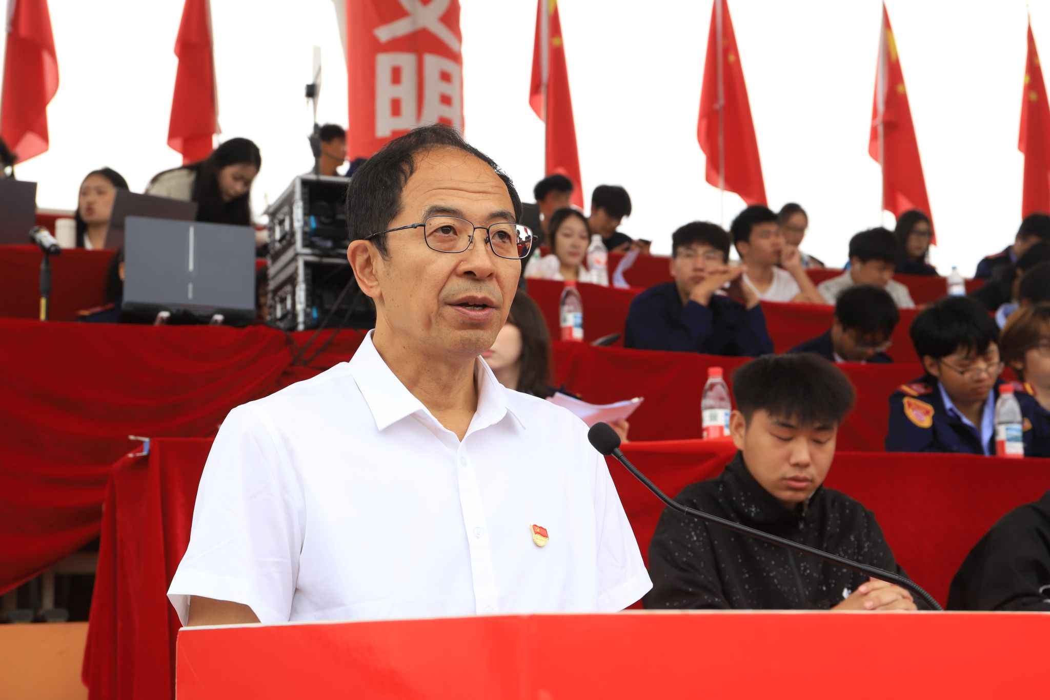 他向全体新同学提出三点希望:一是将个人理想融入家国情怀。二是牢固树立规矩意识。三是尽快实现身份转变。希望全校师生以此次军训为新的起点,铭记历史、砥砺本领,把个人成长融入民族复兴的伟大征程,讲好党的故事、革命的故事、英雄的故事,让红色基因薪火相传,在强国建设、民族复兴的伟业中书写无悔青春!