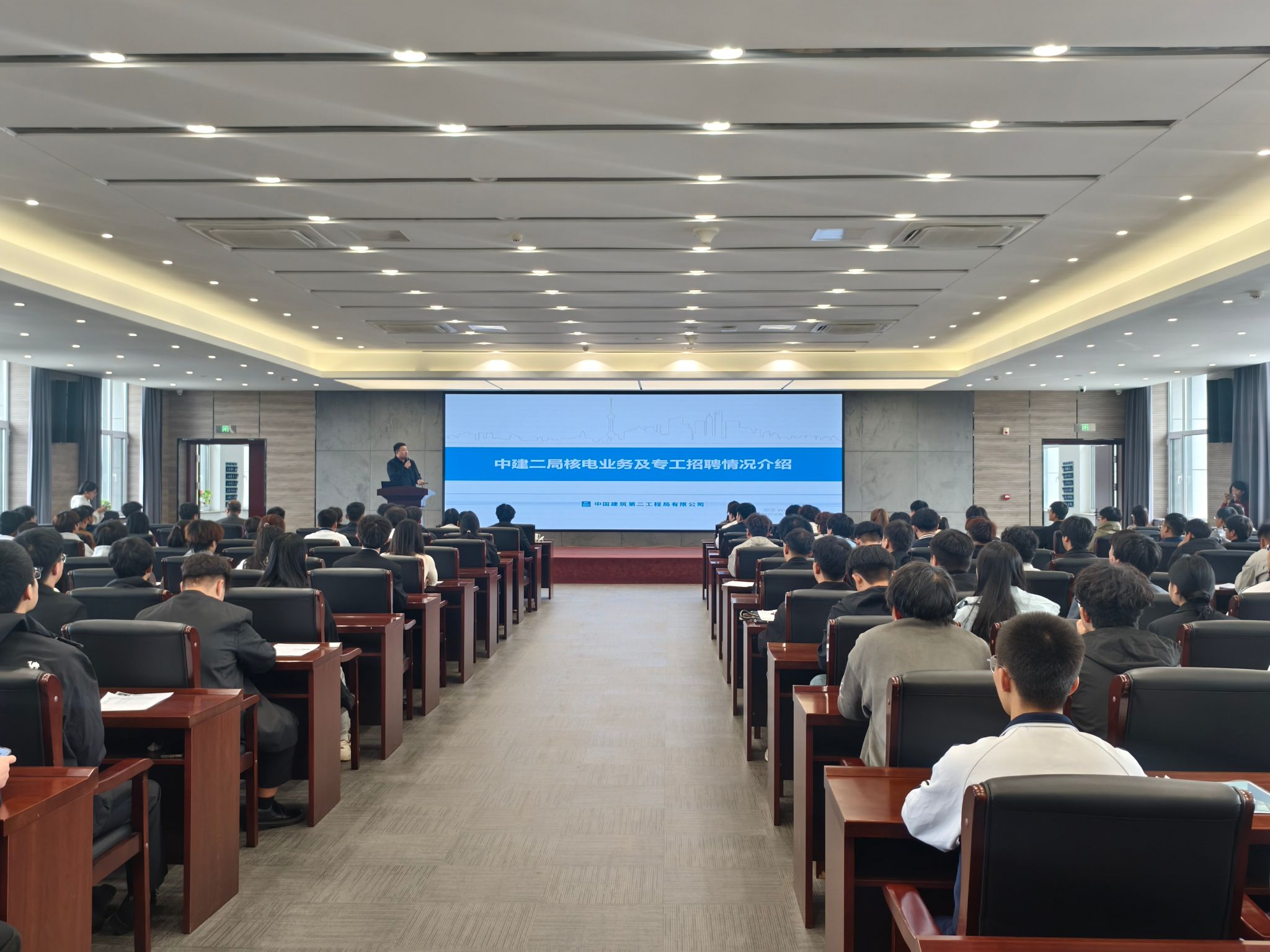 随后,2024级订单班招聘活动在公路与铁道系学术报告厅顺利举行。来自相关专业的200余名学生参与招聘,现场气氛热烈。龚佳文经理就公司发展、企业文化及职业通道作了系统介绍,冷文鹏副书记围绕核电安全进行了专业讲解。互动环节中,同学们就岗位技能要求、职业发展路径等方面踊跃提问,企业代表逐一细致回应,使学生对未来岗位需求有了更清晰的认识。