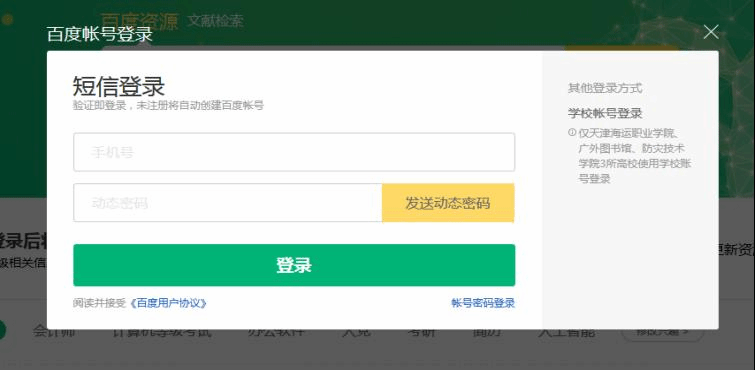 1.在校IP内,登录百度文库高校版(https://eduai.baidu.com),点击 “登录”,输入百度个人账户和密码。如果忘记账密,也可以选择短信快捷登录。