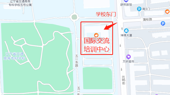 面试考区及报到地点为辽宁省交通高等专科学校国际交流培训中心(沈阳市沈北新区兴明街)。请面试考生走兴明街(学校东侧)进入国际交流培训中心。方位图如下:
