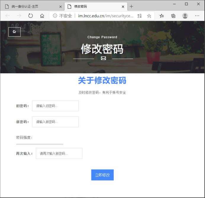 学校统一身份认证系统是重要的身份认证平台,关联多个业务系统,账号密码尤其重要,为保证统一身份认证系统密码安全,现启动平台密保策略(强制绑定密保手机、强制密码长度为8-20位,强制要求包含大小写字母、数字、特殊符号),为方便用户进行密码修改,现在将密码修改方法通知如下: