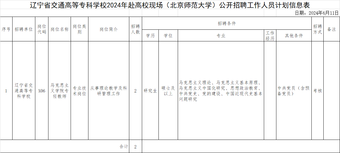 招聘条件与要求详见《辽宁省交通高等专科学校2024年赴高校现场公开招聘工作人员公告》、《辽宁省交通高等专科学校2024年赴高校现场公开招聘工作人员计划信息表》(见学校官网)。