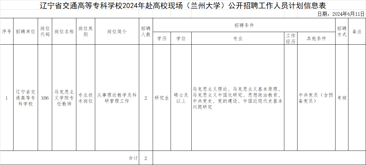 招聘条件与要求详见《辽宁省交通高等专科学校2024年赴高校现场公开招聘工作人员公告》、《辽宁省交通高等专科学校2024年赴高校现场公开招聘工作人员计划信息表》(见学校官网)。