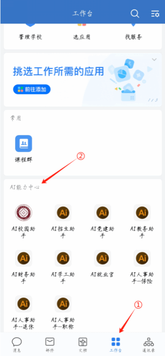 打开学校官方网站,在页面顶端点击“智慧校园服务平台”,登录后进入“AI能力中心”,即可选择需要的AI助手开启对话,我们同步还提供了AI知识库和AI工具供大家使用。