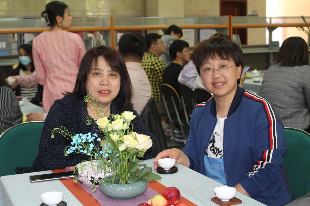活动由学校工会主办,手工艺协会承办,地点设在图书馆文化讲堂,新颖的活动吸引了七十多位老师参加。现场回荡着高山流水般悠扬的古曲,茶席上精心布置了茶具以及精美的茶点鲜花,舒缓着老师们疲惫的身心,感受着茶文化的洗礼与熏陶。