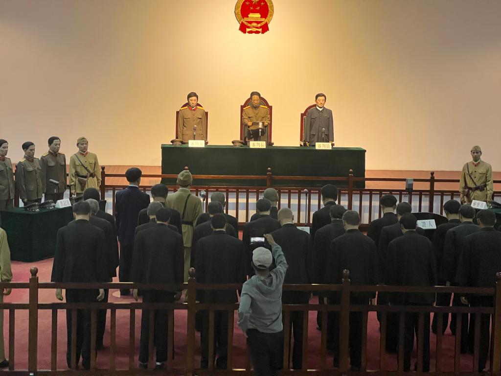 整个展厅分为四个部分,再现了新中国政府引渡、改造、审判、释放日本战犯的历史片段,并用蜡像恢复了审判庭原貌。