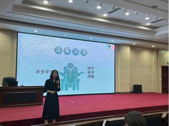 分享中,张晓婷老师从深入沟通、家校联合、共情、自我反思四个方面介绍了与学生情感沟通和谈心谈话的技巧,她总结要用心与学生沟通交流;用心陪伴学生度过他们最难过的时间;用心帮助学生解决问题。