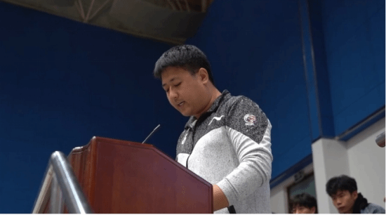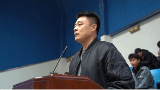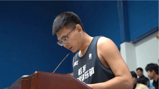 物流管理系2024级邵子昂同学作为学生代表发言,表达了对篮球运动的热爱和对校友、师生的感激之情,并承诺将全力以赴,为比赛贡献自己的力量。