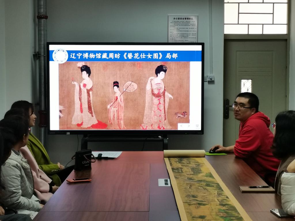 活动特别邀请美育教研室赵春阳老师作题为“辽博藏仇英款《清明上河图》中的团扇文化”讲座。中国团扇历史源远流长,在数千年的发展历程中,团扇承载了深厚的文化底蕴和民族特色。讲座以辽博馆藏《清明上河图》为蓝本,以画中所现团扇为叙事主题,追根溯源、梳理团扇的发展历史;旁征博引,戏说团扇背后的历史典故;欣赏团扇题材古诗、古画扇面,分析团扇的象征意蕴。特别值得一提的是,为配合讲解,赵老师还现场展示辽博馆藏仇英款《清明上河图》一比一复制画卷,总长10.45米,带来全景式的视、触、听震撼交互体验。铺开长卷的一刻,仿佛穿越时空、跨越千年,置身画中,沿着团扇的主线,游历于市井深处,触摸历史,飨食团扇文化所蕴含的婉丽、典雅、含蓄、内敛的东方之美及其渗透的儒哲蕴涵。于现场观众而言,无疑是一场文化艺术盛宴。