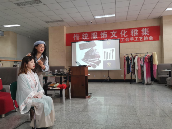 为纪念第113个“三八”国际劳动妇女节,校工会手工艺协会于3月10日中午在图书馆文化大讲堂开展了“流光溢彩庆三八”为主题的女教职工传统服饰文化雅集活动。