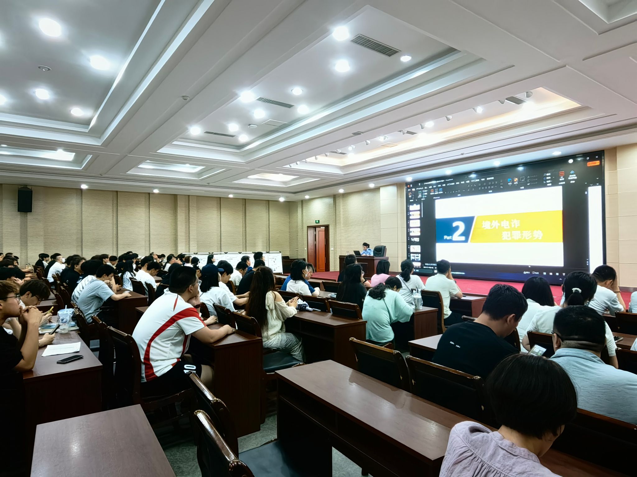 为增强师生的反诈骗意识,提高防范诈骗能力,营造安全和谐的校园环境,6月30日下午,学生工作处、安全保卫处在素质中心101报告厅成功举办了一场别开生面的反诈骗知识讲座。此次讲座特邀沈阳市公安局沈北分局新型犯罪研究中心桑俊警官主讲,学生工作处、安全保卫处负责人及相关人员、各教学系党总支副书记、全体辅导员、学生会主席团成员、2024级学生干部代表等300余人参加讲座。