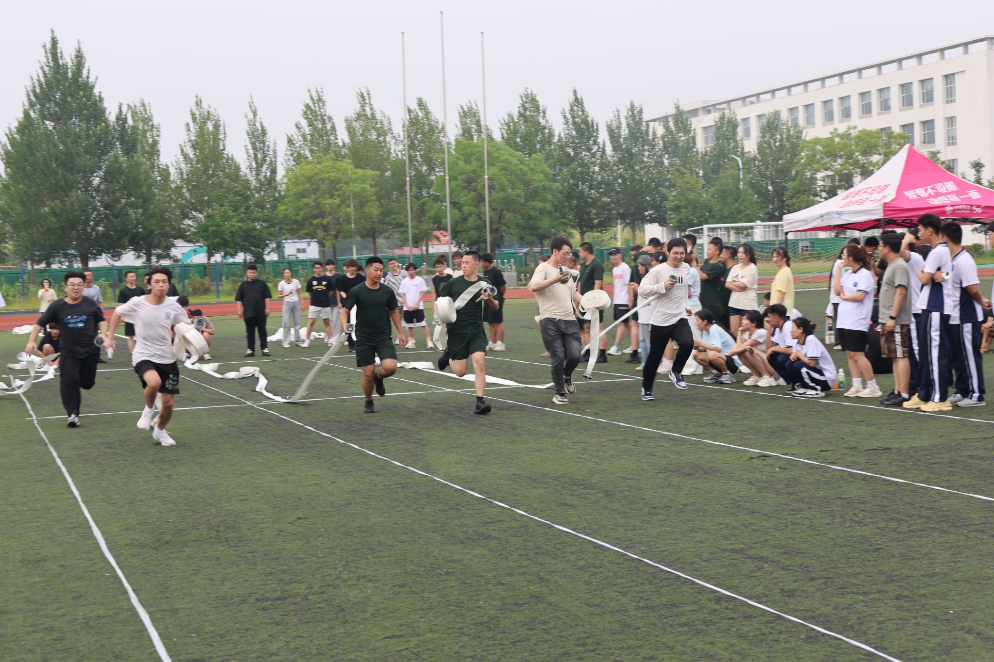 本次消防趣味运动会设有水桶接力穿越障碍、灭火器接力、消防水带连接、火场救援、担架救援、火场逃生6个比赛项目。比赛过程中,参赛队员们情绪高昂,团结协作、奋勇拼搏、争先创优,将体育竞技的蓬勃活力与扎实的消防知识深度融合,在赛场上绽放出绚丽的青春光彩。现场观众也深受鼓舞,用热烈的欢呼为场上的选手加油鼓劲,在观摩中学习消防器材的使用常识。