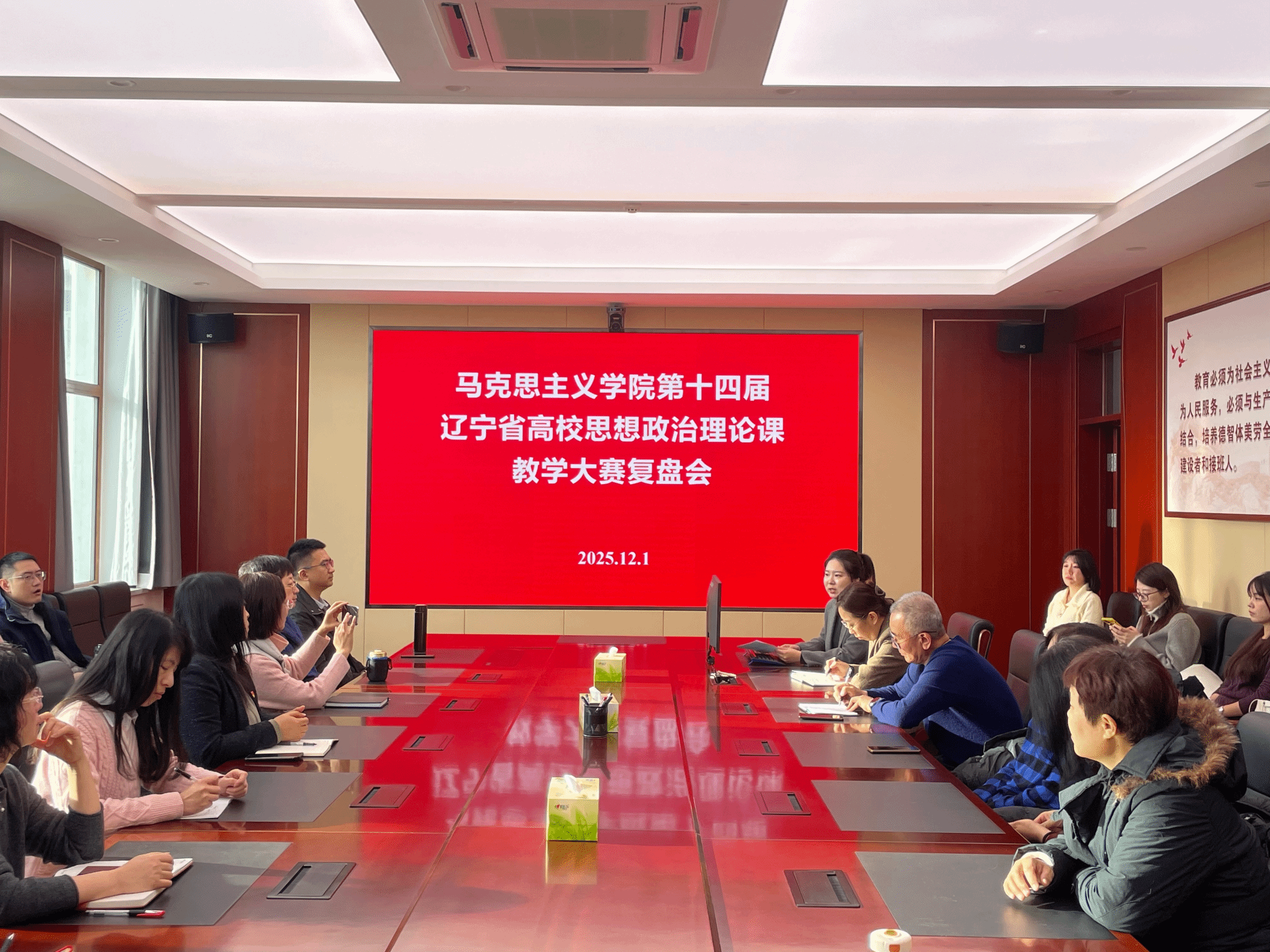 为深入贯彻落实习近平总书记在学校思想政治理论课教师座谈会上的重要讲话精神,全面提升思政课教师的教学与竞赛能力,马克思主义学院于2025年12月1日在办公楼301会议室举办了思政课教师“骨干大练兵”活动颁奖仪式暨第十四届辽宁省高校思想政治理论课教学大赛复盘会。会议由马克思主义学院副院长王帅乔主持,全体思政课教师与会。