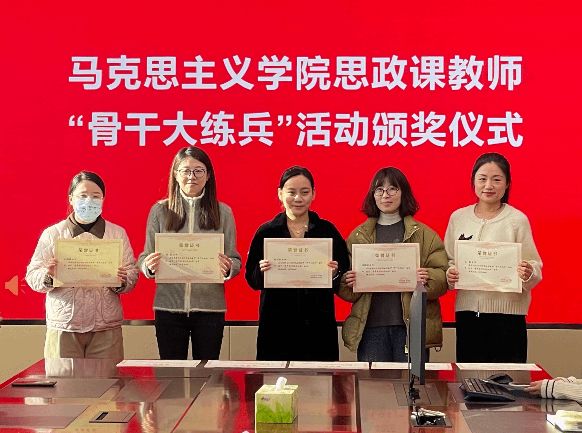 会议首先为在学院第二届思政课教师“骨干大练兵”活动中荣获“青年教学技能标兵”称号及“优秀课件”“优秀案例”单项奖的教师颁奖。学院党总支书记李玉巧、院长戴茹、党总支副书记李萌旸及各教研室评审成员为获奖教师颁发荣誉证书。