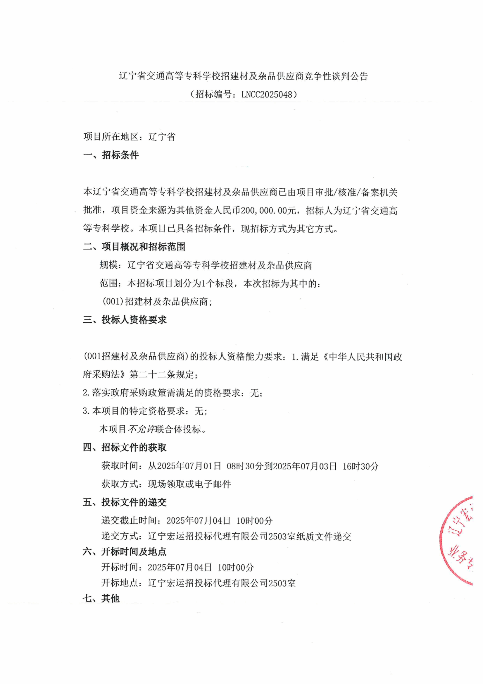 辽宁省交通高等专科学校招建材及杂品供应商竞争性谈判公告(LNCC2025048)